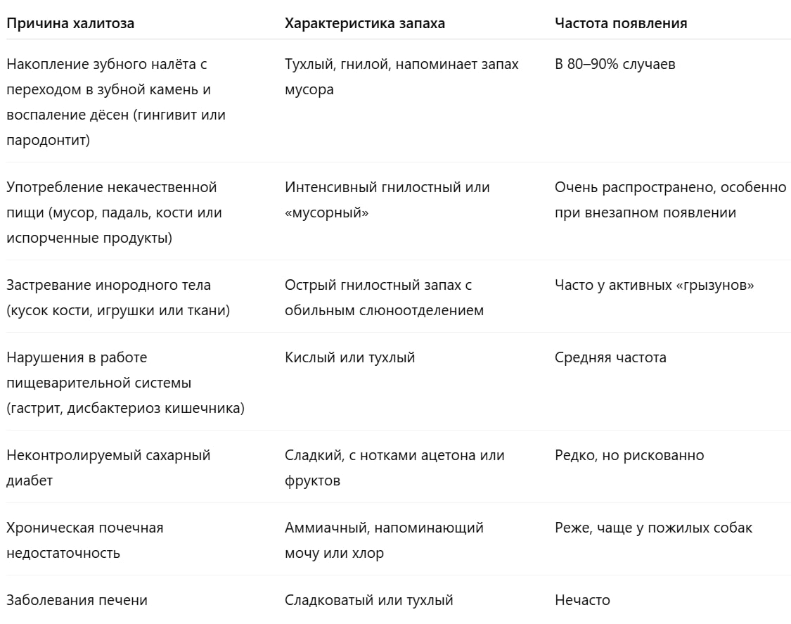 Мы собрали список наиболее вероятных причин неприятного запаха изо рта у собаки. Причины отсортированы по частоте — от самых распространённых до встречающихся в ветеринарной стоматологии реже. Для каждой указано, как обычно пахнет и насколько часто это бывает.