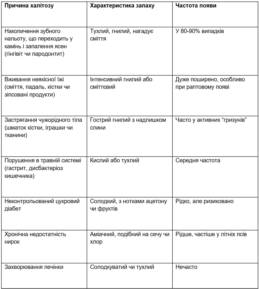 Ми склали список основних причин неприємного запаху з рота у собаки, базуючись на досвіді. Вони відсортовані за ймовірністю: від тих, що трапляються найчастіше, до більш складних, які ми зустрічаємо в ветеринарній стоматології. Кожна причина супроводжується описом запаху, частотою.